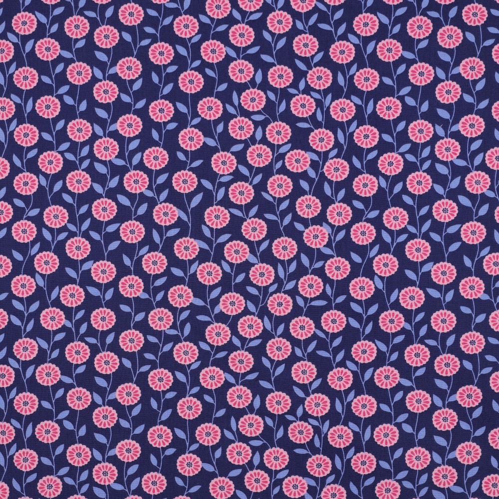 Bomullspoplin Blommor och blader marinblå/rosa fg 3