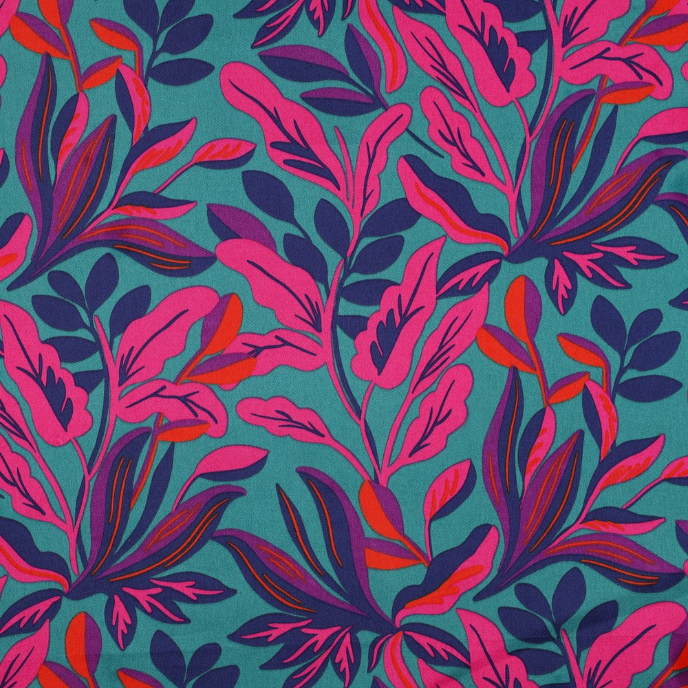 Oj, vilka färger, mönster och lyster! En mjuk och behaglig satinväv med mönster och färger som gör en alldeles bubbelglad. Nerida Hansen kan verkligen det där med mönster och färgkombinationer. Längsta bladet är ca 10cm. Vad gör man av denna då? Typ allt! Pyjamasbyxor, duk, gardiner, klänning etc.