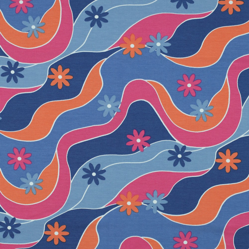 En virvlande färgglad flod där blommor flyter fram. Ganska trevligt, eller hur? Blommorna är ca 3cm. Ett trikåtyg i en typisk tights/t-shirt-kvalité, med en stretch som gör att det lämpar sig både till tightare och lösare plagg. Det är mjukt, följsamt och framförallt väldigt bekvämt.
