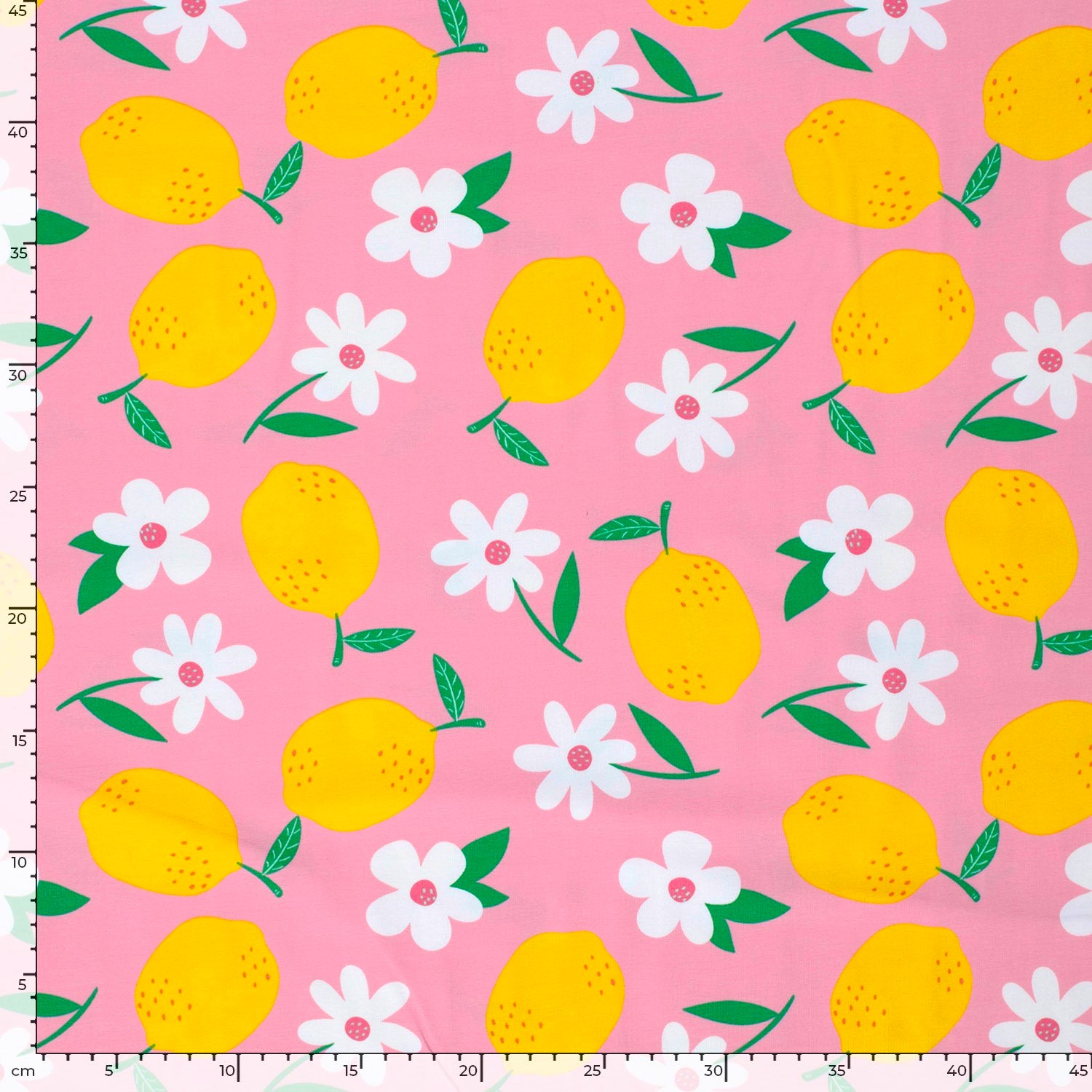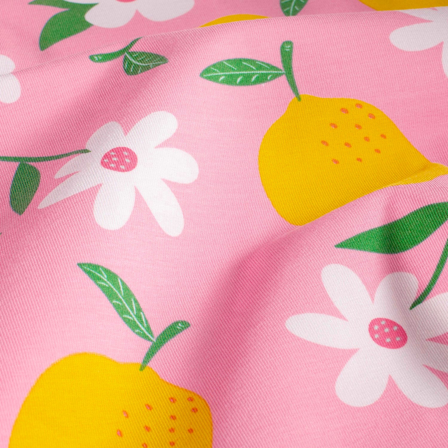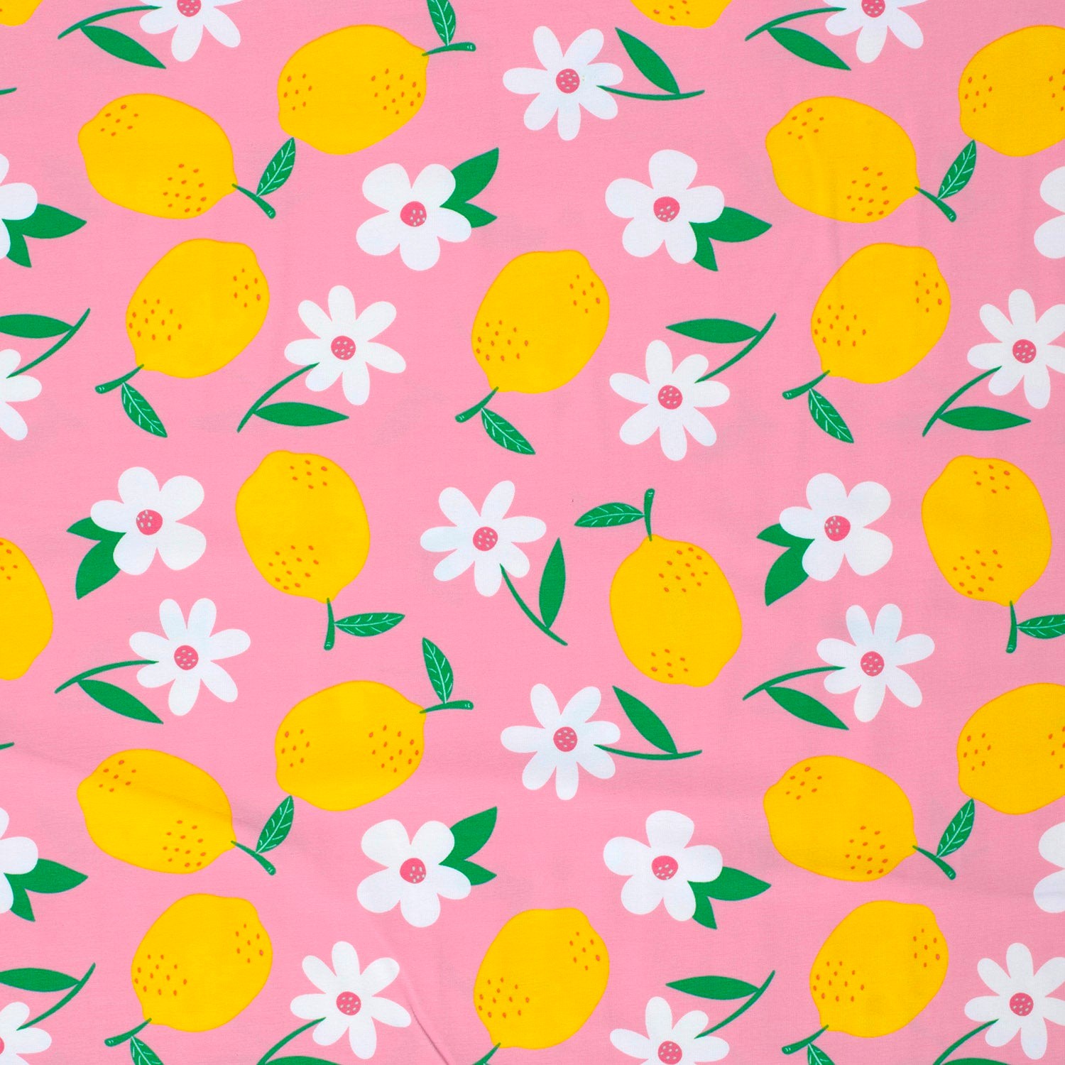 Här hoppar solskensgula citroner fram på en bubbelgumsrosa scen medan vita blommor dansar i bakgrunden. Kan det bli somrigare än så?