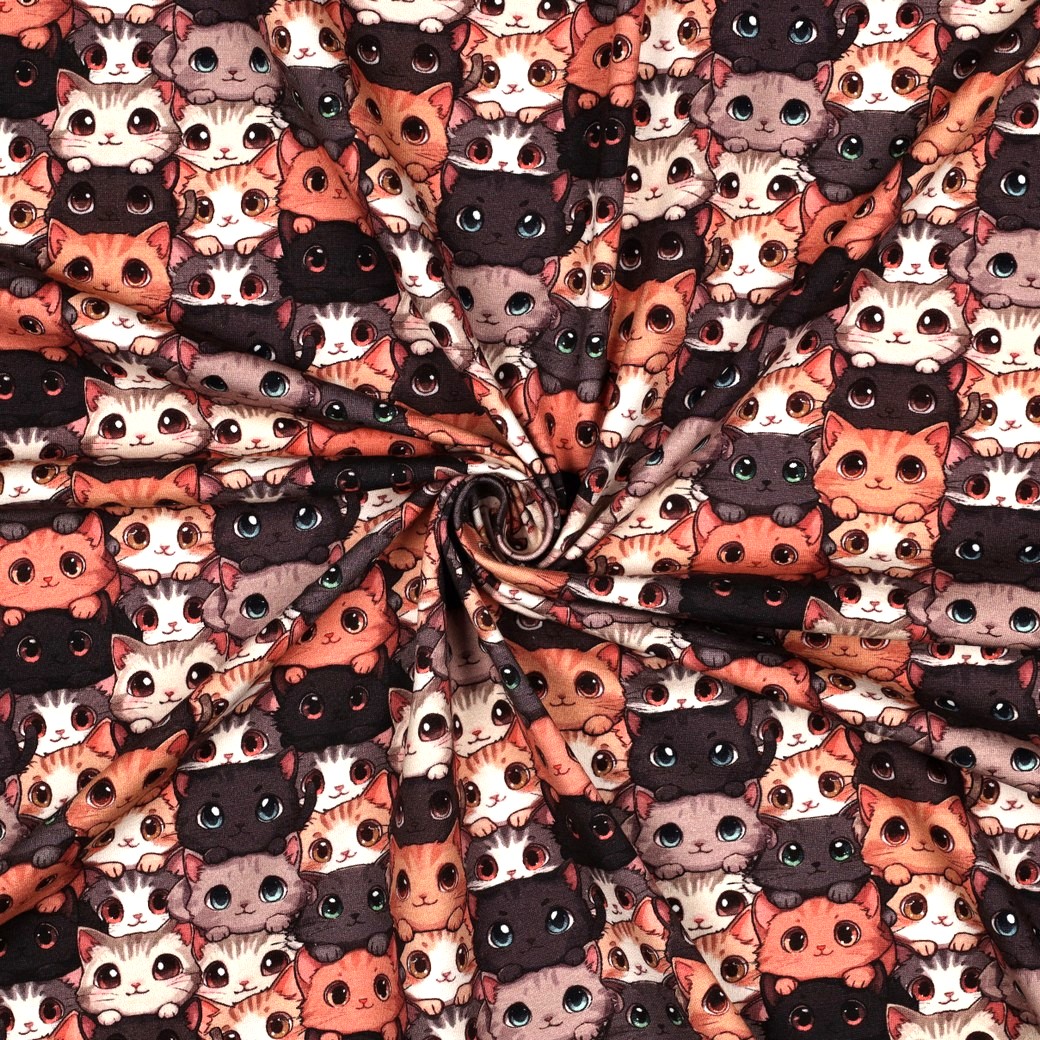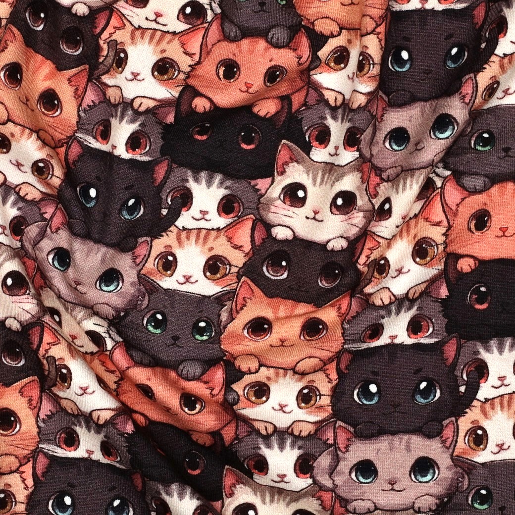 LÄGG AV! Det här går liksom inte, att inte tokcharmas av. Varje litet kattansikte är mellan 3 och 4 cm. Ett trikåtyg i en typisk tights/t-shirt-kvalité, med en stretch som gör att det lämpar sig både till tightare och lösare plagg. Det är mjukt, följsamt och framförallt väldigt bekvämt.