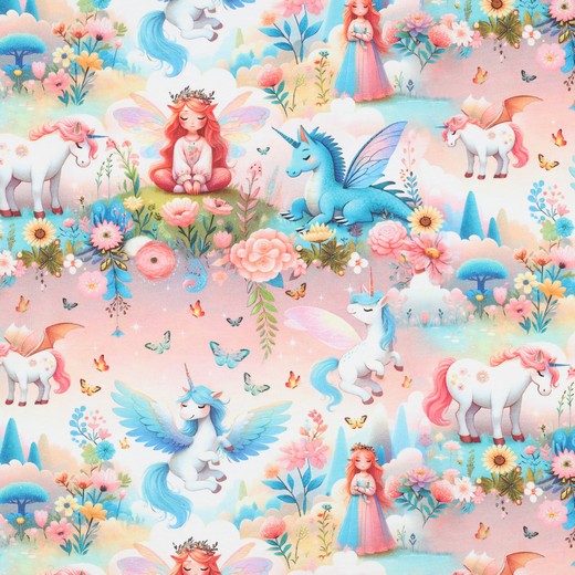 En mediterande älva, blommor och enhörningsdrakar. Kan det bli bättre? Största fjärilen är 2cm. Ett trikåtyg i en typisk tights/t-shirt-kvalité, med en stretch som gör att det lämpar sig både till tightare och lösare plagg. Det är mjukt, följsamt och framförallt väldigt bekvämt.