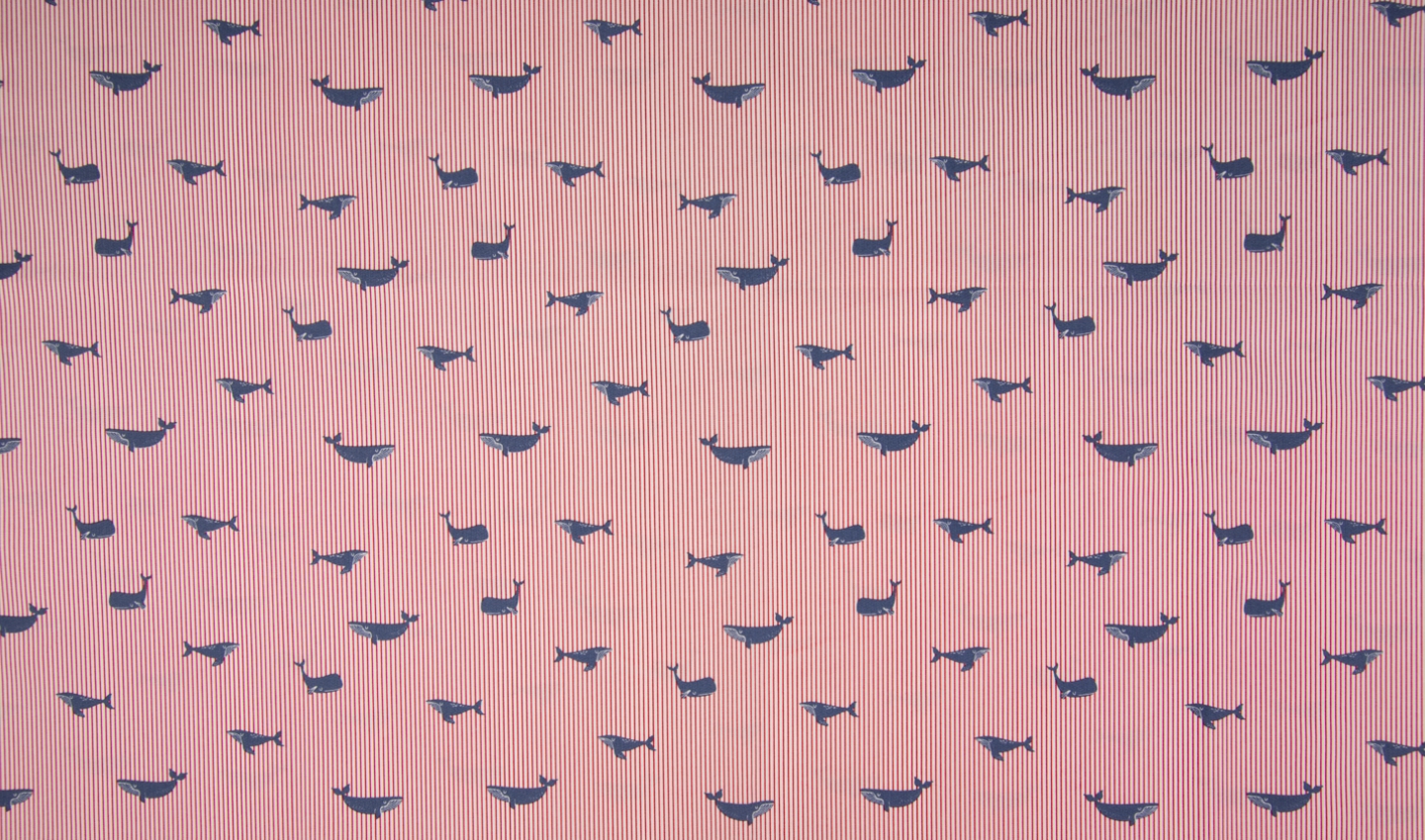 Här är tyget som skriker sommar, på det där strandiga, sandiga, mysiga sättet. Och valar? Vi stöttar dem till 100%. En härlig bomullspoplin (=tätvävd). Gör sig lika bra i babynestet, som i skjortan, som i kjolen, som i gardinen, som i örngottet, som i, ja, du förstår, den passar till lite utav varje.