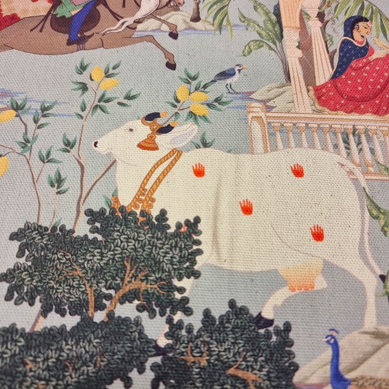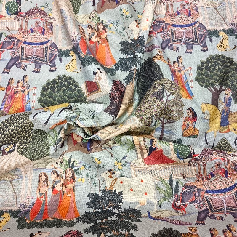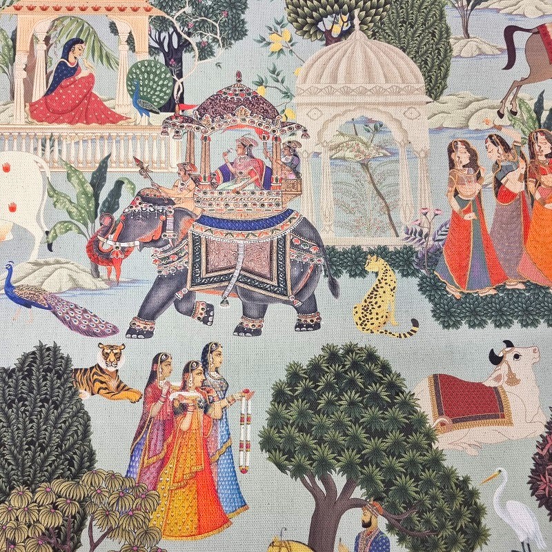 En svunnen tid fångad i en väv. Det är som att stå framför en vacker målning på ett museum. Så många detaljer, så många färger. Elefanter, hästar, vackra kläder, träd och byggnader. Helt fascinerande. En kraftig bomullsväv, som lämpar sig till kuddar, gardiner, dukar, klä om stolsdynor, kassar, väskor, dynor, byxor etc.