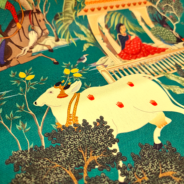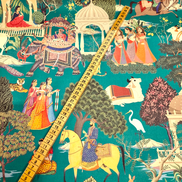 En svunnen tid fångad i en väv. Det är som att stå framför en vacker målning på ett museum. Så många detaljer, så många färger. Elefanter, hästar, vackra kläder, träd och byggnader. Helt fascinerande. En kraftig bomullsväv, som lämpar sig till kuddar, gardiner, dukar, klä om stolsdynor, kassar, väskor, dynor, byxor etc.