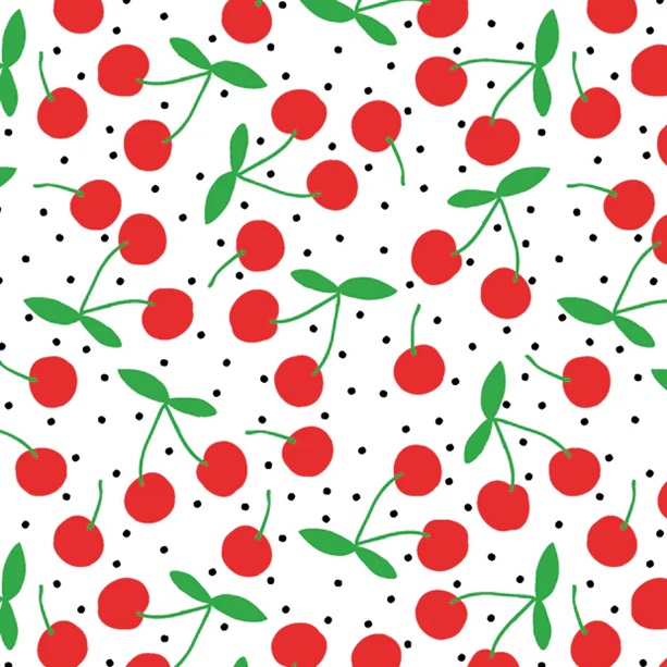 Här är tyget som skriker sommar, på det där nostalgiska, rockabillyiga sättet. Varje körsbär är ca 1cm. En härlig bomullspoplin (=tätvävd). Gör sig lika bra i babynestet, som i skjortan, som i kjolen, som i gardinen, som i örngottet, som i, ja, du förstår, den passar till lite utav varje.