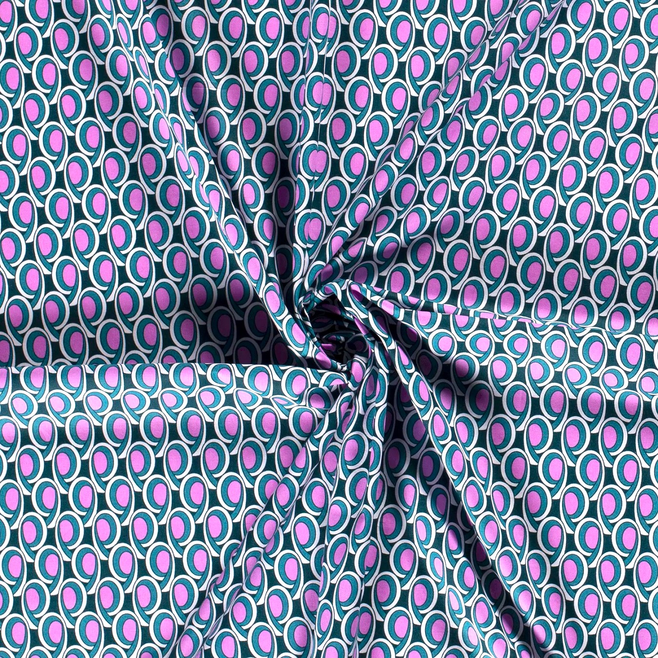 En mjuk och behaglig bomullsväv vars mönster och färger tydligt flörtar med retrokänslan. Är det 60-tal eller 70-tal? Är det en nia eller ett kommatecken? Krumeluren är i alla fall 4cm hög. Gör sig lika bra i babynestet, som i skjortan, som i kjolen, som i gardinen, som i örngottet, som i, ja, du förstår, den passar till lite utav varje. Glömde shopingkassen!