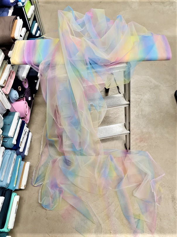 Ett sådant där tyg som får världen att stanna upp en liten stund. Du tänker ”Jag kan inte leva utan den!”. En mjukare tyll med en pastellig regnbåge. Lite lätt stretchigt, men inte tillräckligt för ett riktigt tight plagg. Tänk dig den där drömmiga klänningen, överdådiga sänghimlen eller den där puffiga tyllkjolen.