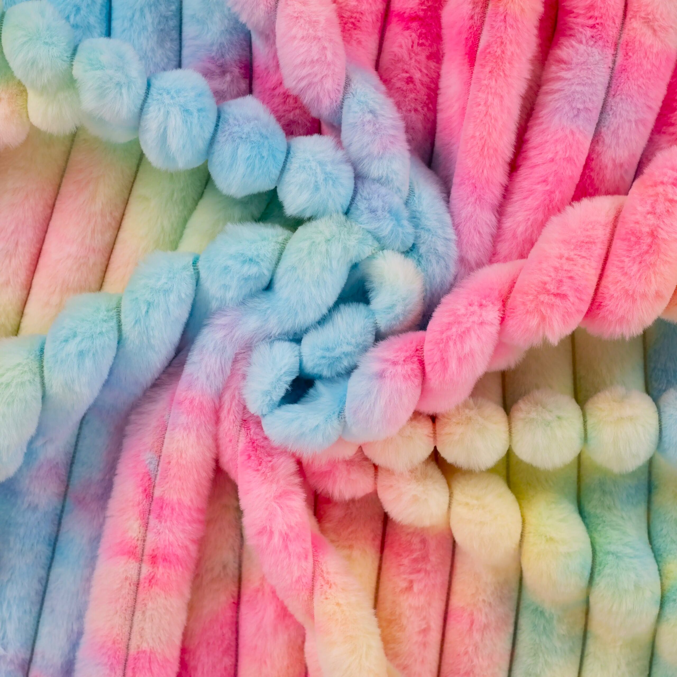 Oj, oj, ooooj! Pälsen man inte vill sluta klappa på. Att den sen har så härligt glada färger är ju inte dumt det heller. Tänk dig en enkel bolero av en fyrkant, så har du en regnbåge att ta med dig. Eller som en gosfilt att ha i soffan? Yes, please!