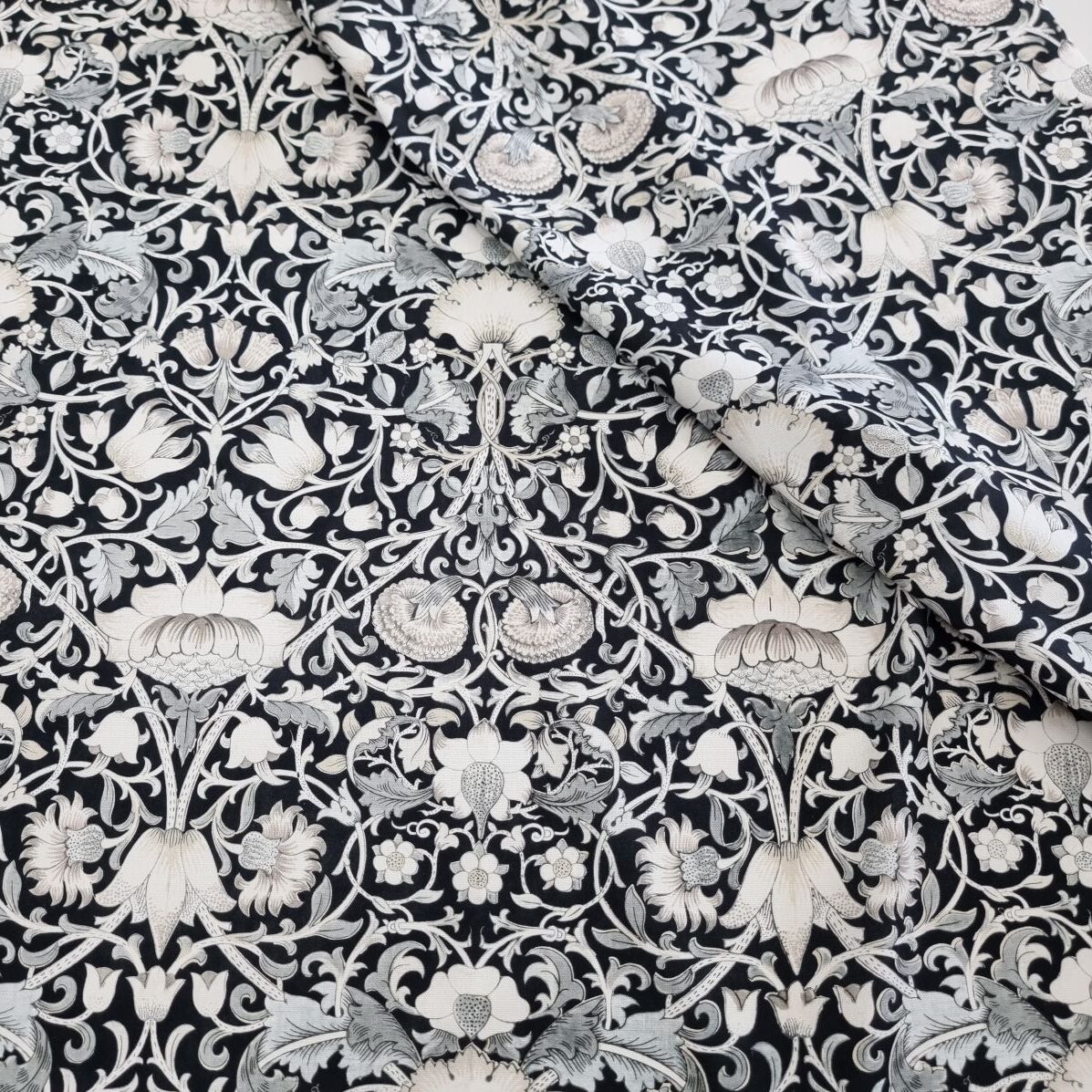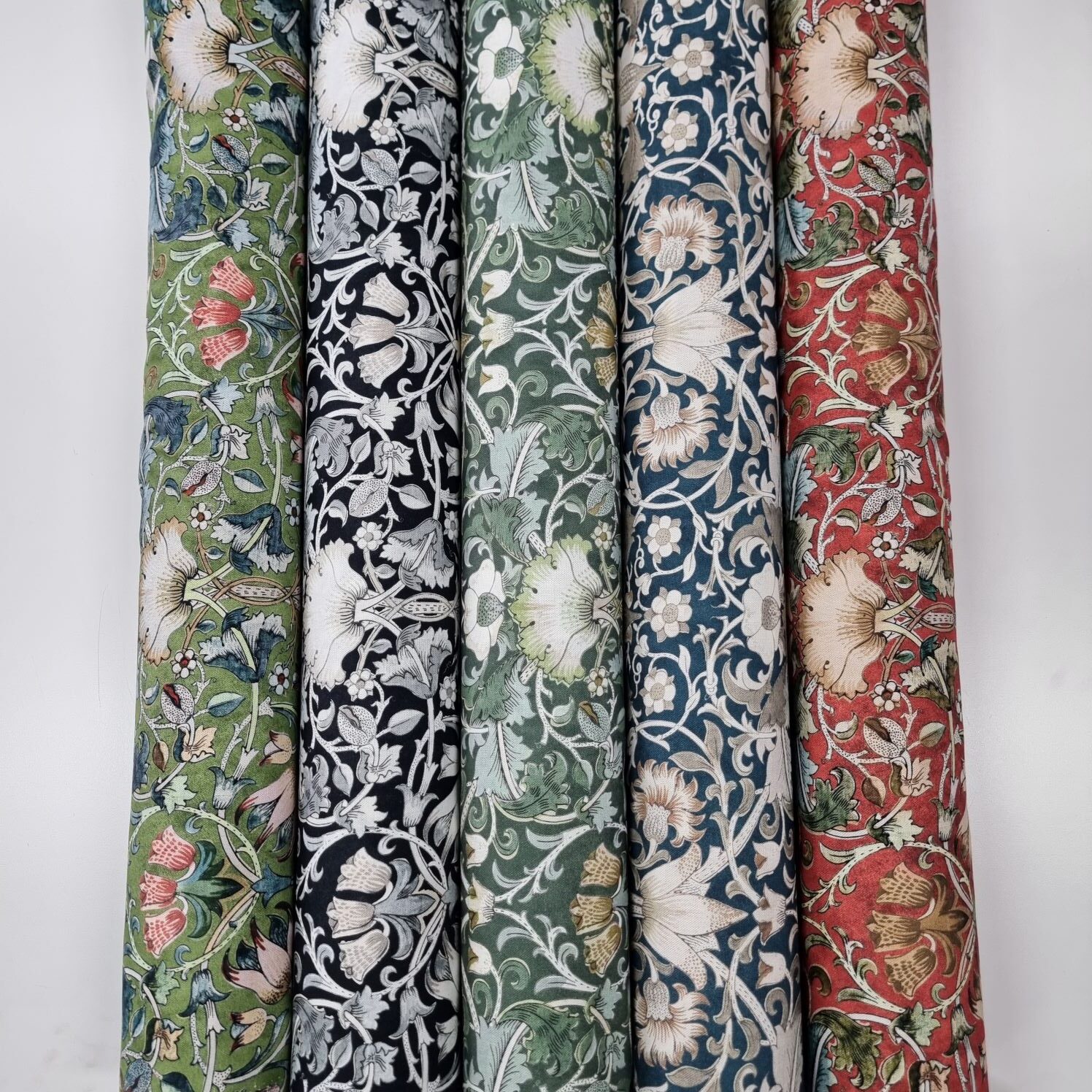 Klassiskt blommönster som för tankarna till Morris och afternoon tea med sina harmoniska färgställningar. En lite kraftigare väv, som lämpar sig till kuddar, gardiner, dukar, klä om stolsdynor, kassar, väskor etc.