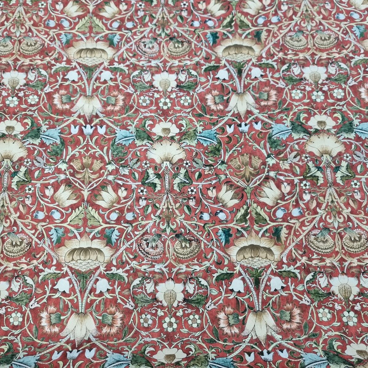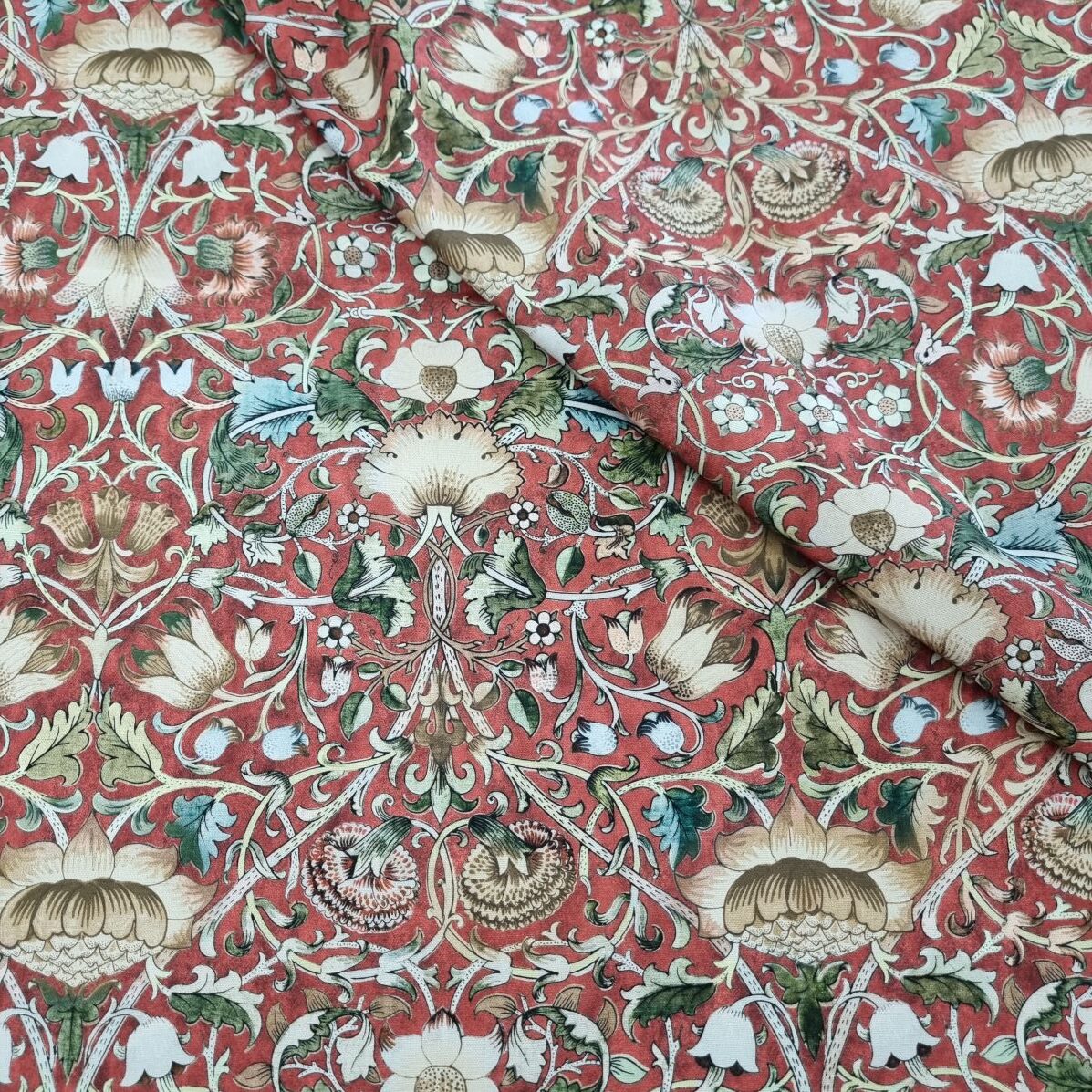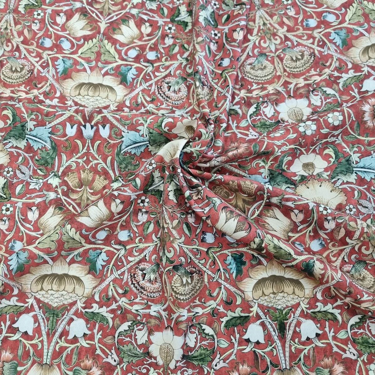 Klassiskt blommönster som för tankarna till Morris och afternoon tea med sina harmoniska färgställningar. En lite kraftigare väv, som lämpar sig till kuddar, gardiner, dukar, klä om stolsdynor, kassar, väskor etc.