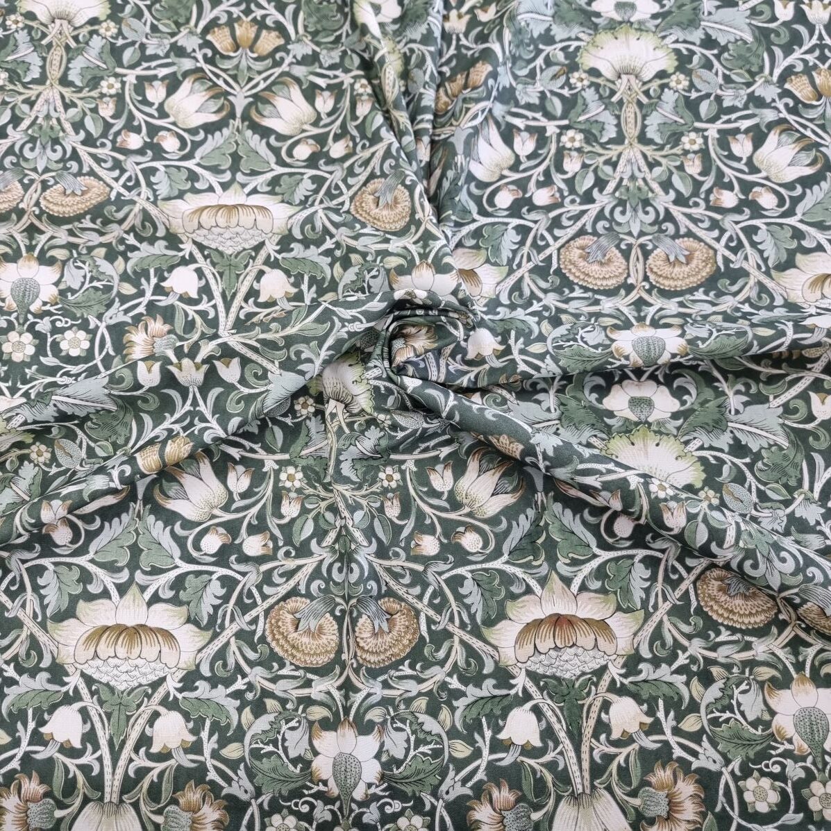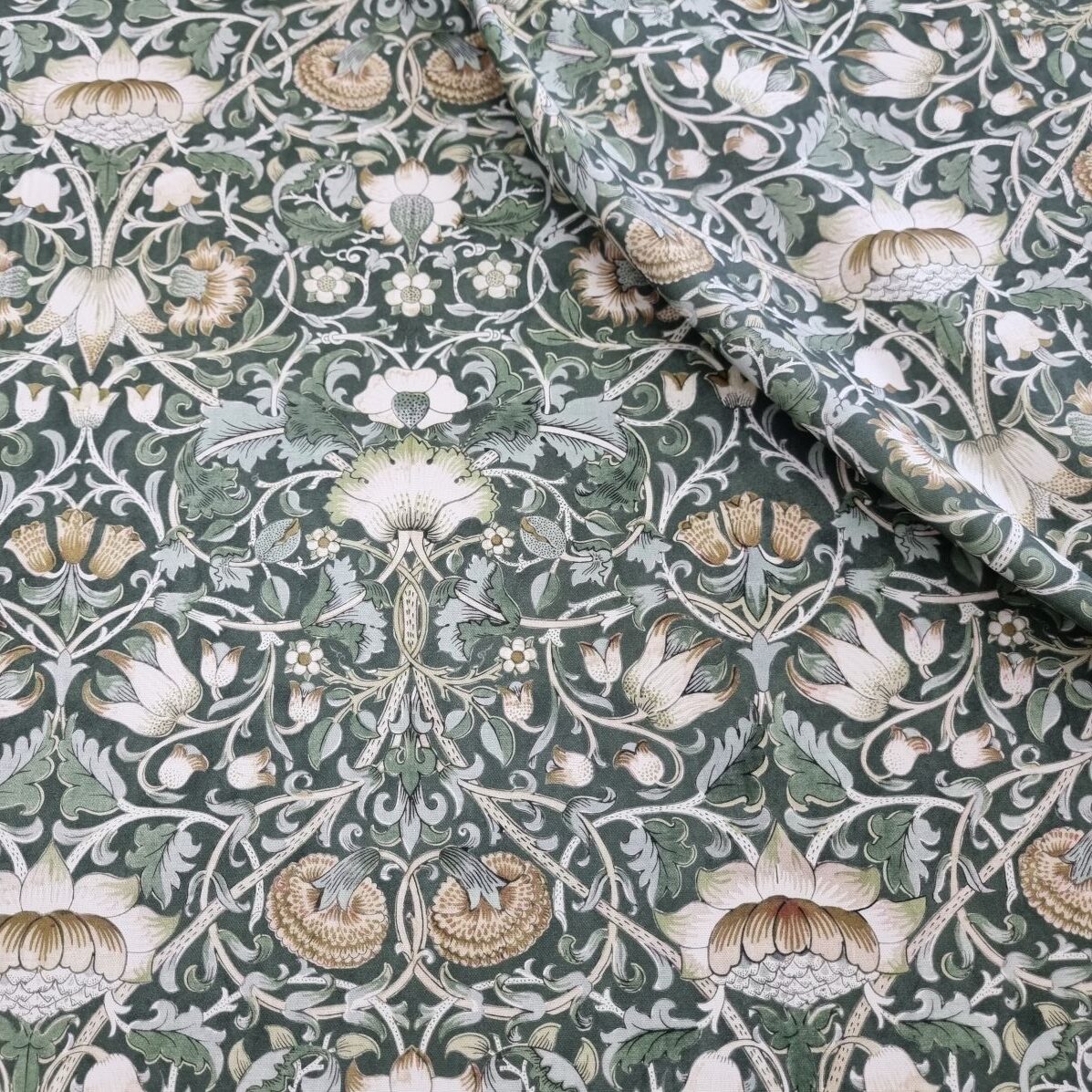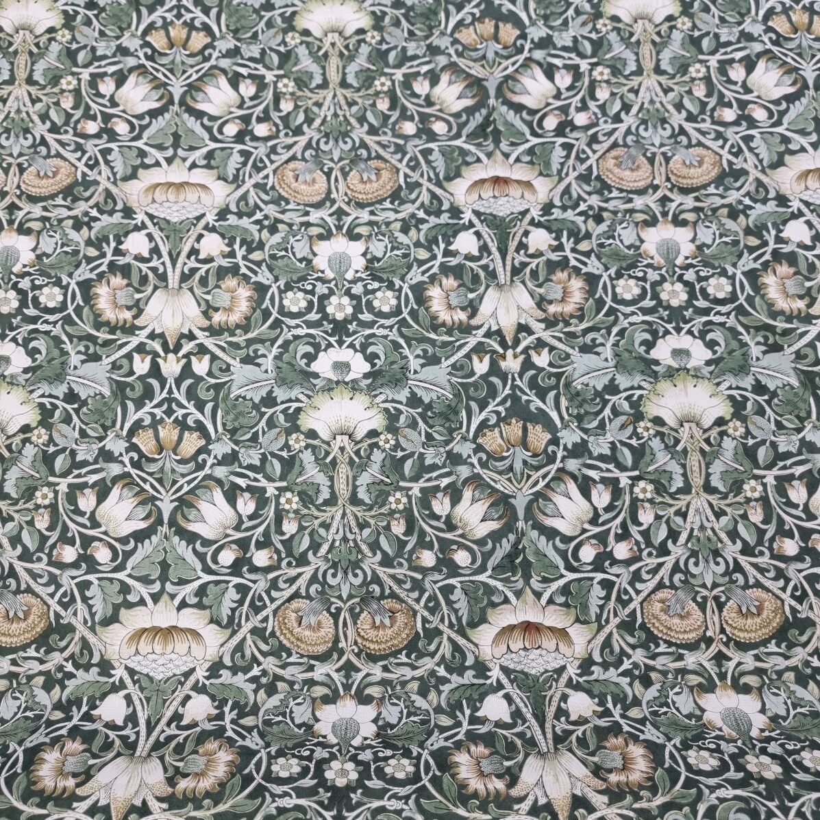 Klassiskt blommönster som för tankarna till Morris och afternoon tea med sina harmoniska färgställningar.  En lite kraftigare väv, som lämpar sig till kuddar, gardiner, dukar, klä om stolsdynor, kassar, väskor etc.