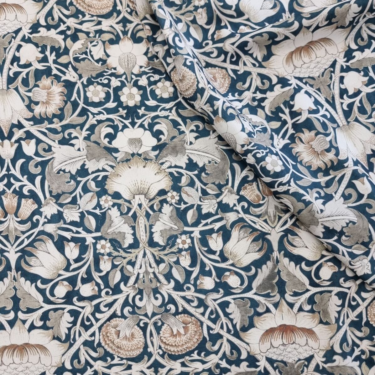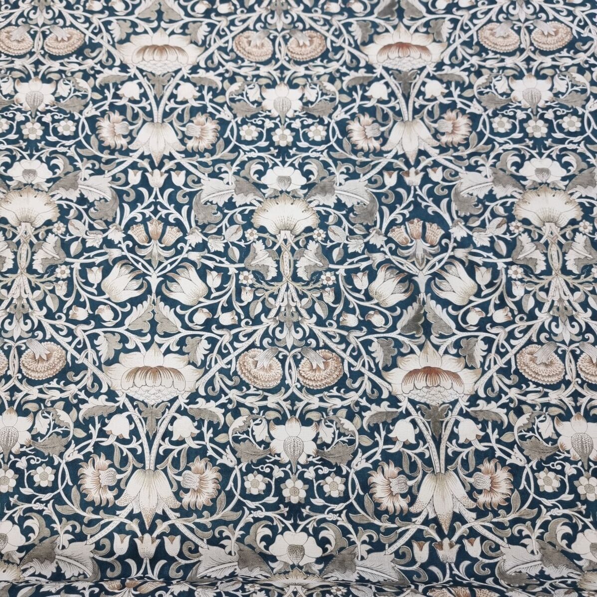 Klassiskt blommönster som för tankarna till Morris och afternoon tea med sina harmoniska färgställningar. En lite kraftigare väv, som lämpar sig till kuddar, gardiner, dukar, klä om stolsdynor, kassar, väskor etc.