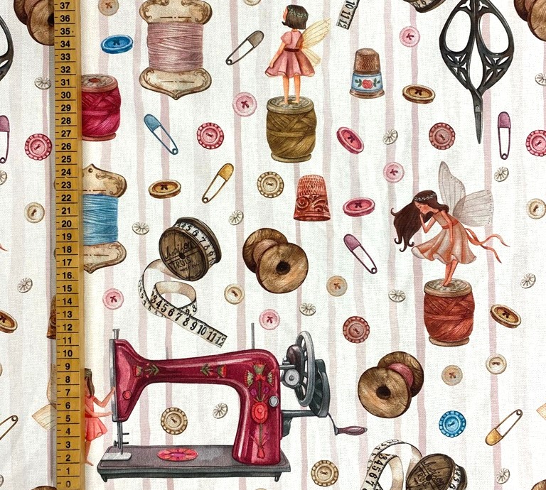 Synördar, se hit! Symaskiner, knappar och säkerhetsnålar m.m på ett tyg, kan det bli bättre? Dessutom med älvor som bonus. Vit botten med lodräta rosa ränder finns bakom dessa härliga motiv. Tryckt på en lite kraftigare bomullsväv, som lämpar sig till kuddar, gardiner, dukar, klä om stolsdynor, kassar, väskor etc.