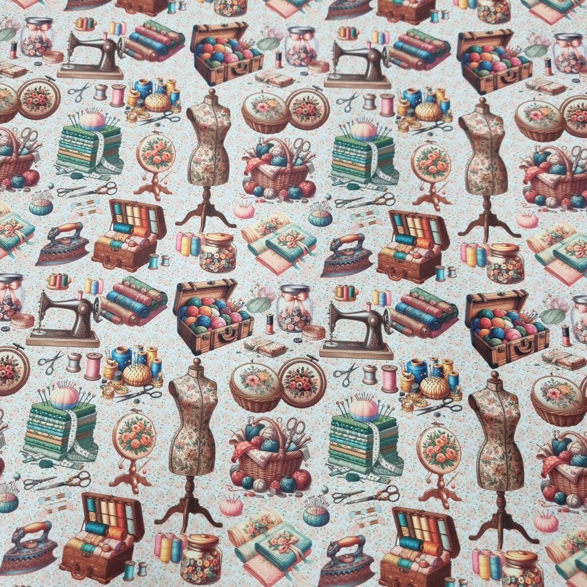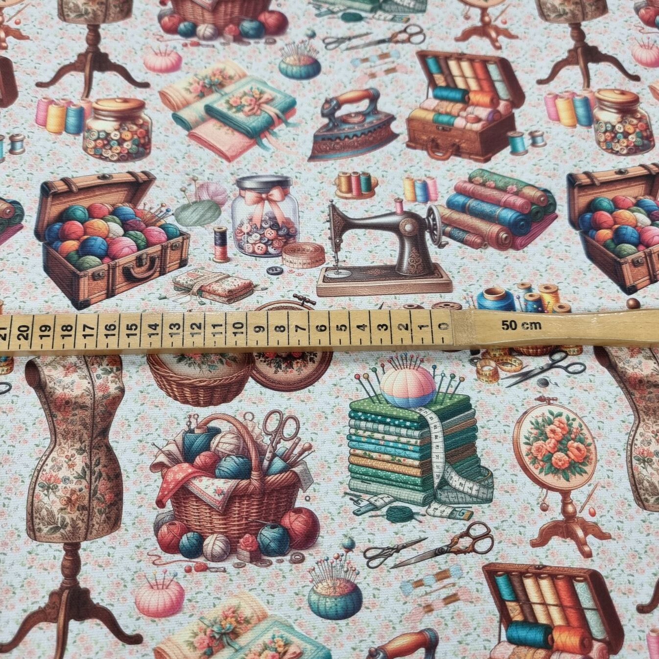 Jag syr lite….. Jag syr lite till…. Äh, jag låser in mig i källaren och syr ! Tyg med sömnadsdetaljer , tryckt på en lite kraftigare bomullsväv, som lämpar sig till kuddar, gardiner, dukar, klä om stolsdynor, kassar, väskor etc.