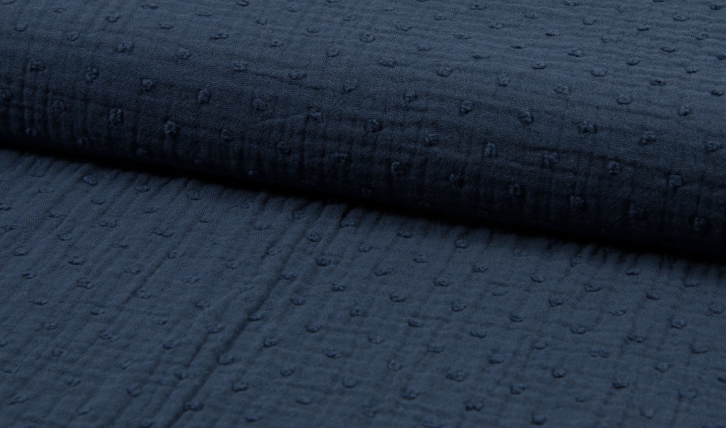 Ett dubbelvävt, otroligt behagligt bomullstyg med en liten skrynklig struktur och en mjuk liten mouche/prick. Wow! Passar ypperligt till sommarblusar, skjortor, klänningar, gardiner, skira duken, kuddfodral etc.