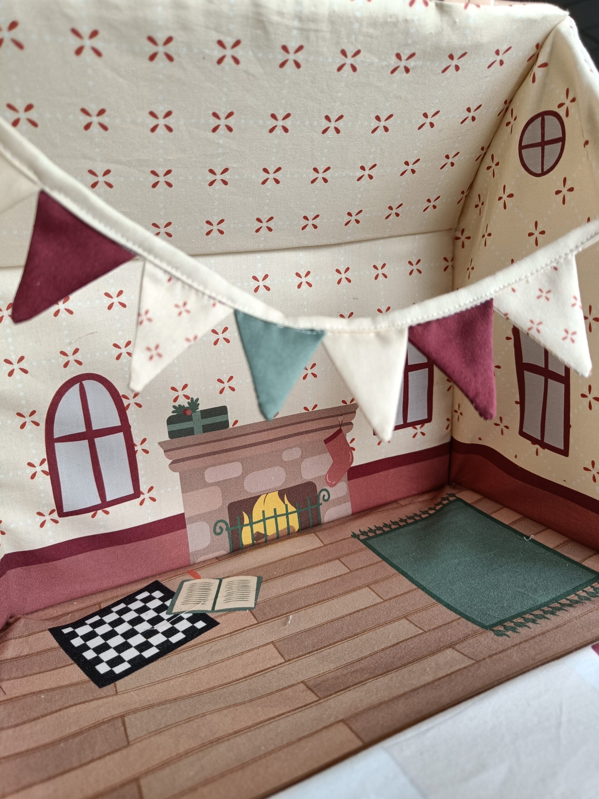 Visst känner man ibland starkt för att julpyssla, men orkar eller hinner inte med alla de där förberedelserna runtomkring? Då har du lösningen här! En panel (alltså ett stycke tyg, på 98 cm x 148 cm i det här fallet) med tryckta mönsterdelar för att göra ett mjukt litet dockhus i pepparkaksstil. En pepparkaksgubbe och en snögubbe följer med och vill gärna flytta in, tillsammans med dekorationer av olika slag.