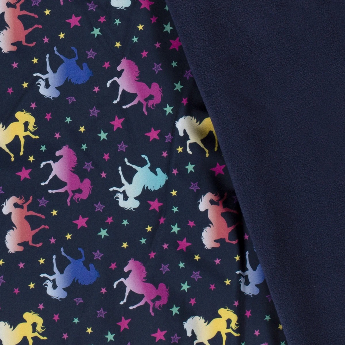 Ganska så perfekt jack-/överdragsbyxtyg för dig som inte riktigt kan få nog av hästar och regnbågsfärger. Relativt mjukt och följsamt material bestående av 2 lager. Innerst kommer den värmande fleecen och ytterst kommer en tålig polyesterväv. Den är i princip helt vindtät men inte helt och hållet vattentät. Tyget andas bra och torkar på ett kick, vilket gör detta till ett material för dig som vill vara ute (och leka mycket).