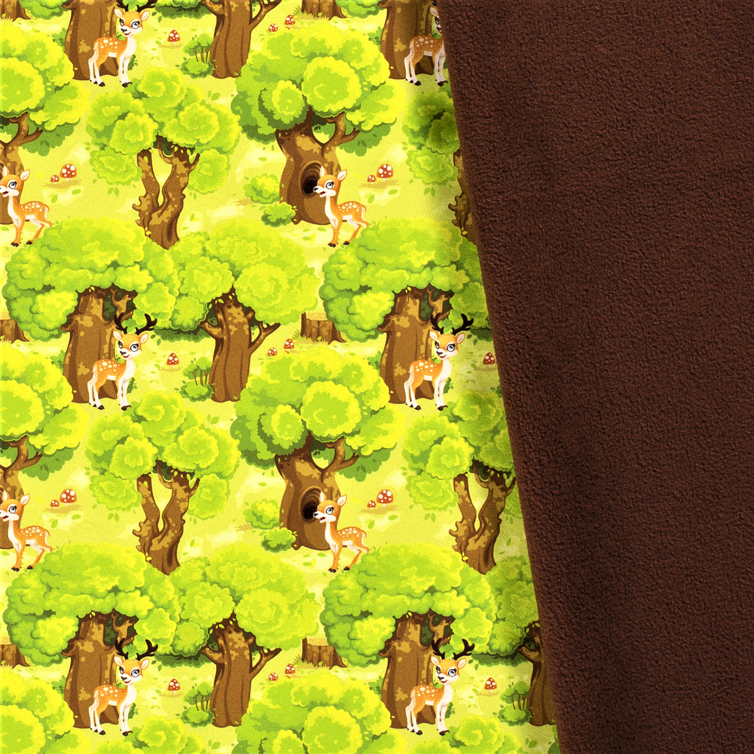 En riktig sagoskog med träd, flugsvampar och rådjur. Relativt mjukt och följsamt material bestående av 2 lager. Innerst kommer den värmande fleecen och ytterst kommer en tålig polyesterväv. Den är i princip helt vindtät men inte helt och hållet vattentät. Tyget andas bra och torkar på ett kick, vilket gör detta till ett material för dig som vill vara ute och leka mycket.