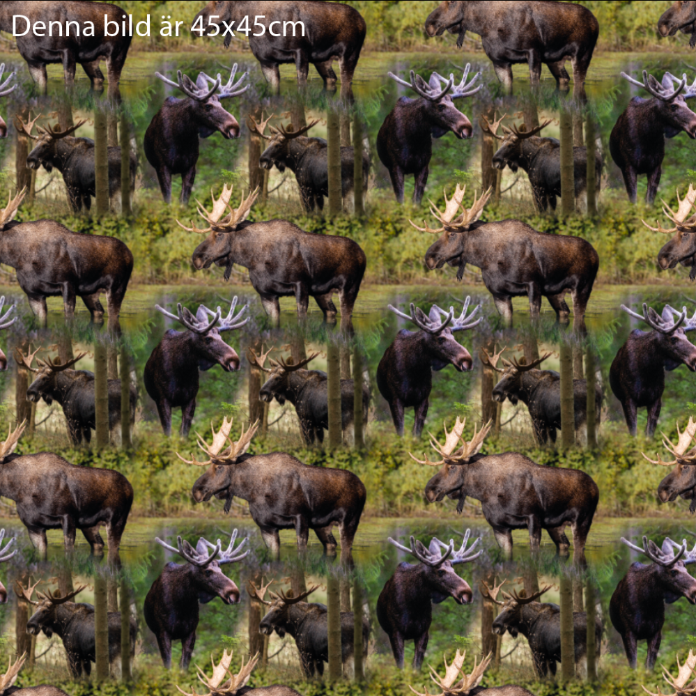 Skogens konung i högform. Största älgen är ca 10cm. Digitaltryckt bomullstrikå av hög kvalitet. Passar bra till klädsömnad mm.