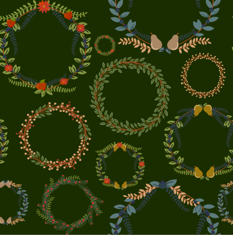 Ibland är det, det enkla som vinner. Lite kvistar, bär och ris och så är det klart. Största kransen är ca 10cm. Digitaltryckt bomullstrikå av hög kvalitet. Passar bra till klädsömnad mm.[/vc_column_text][/vc_column][/vc_row]