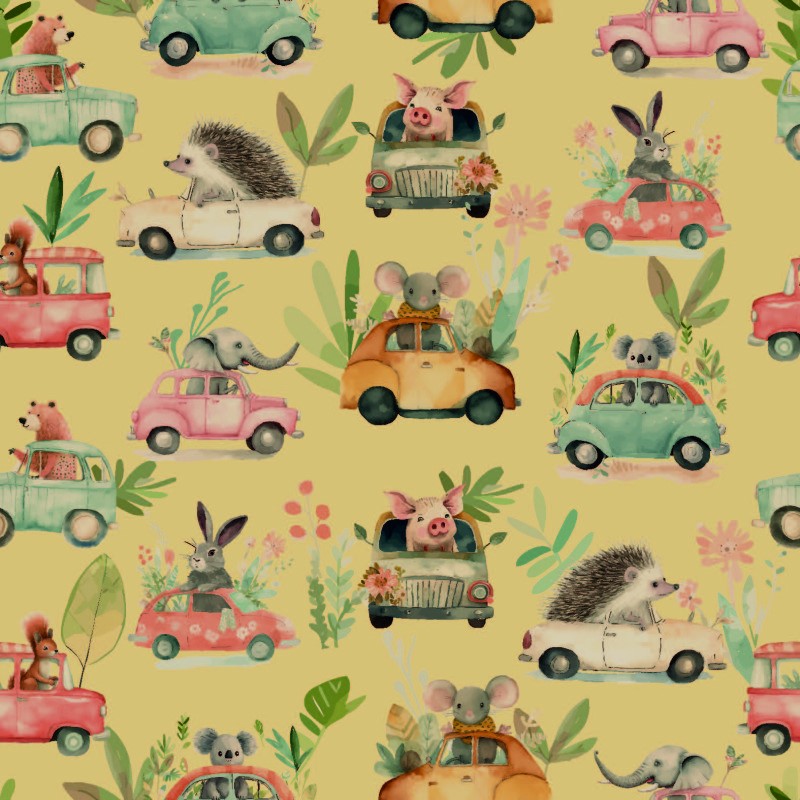 Alltså det här gänget, vilka goa typer! Det är ju faktiskt inte varje dag en får se elefanter, igelkottar, grisar, koalor etc vara ute och köra sina gamla bilar. Högsta ekipaget är ca 5cm. Digitaltryckt bomullstrikå av hög kvalitet. Passar bra till klädsömnad mm.