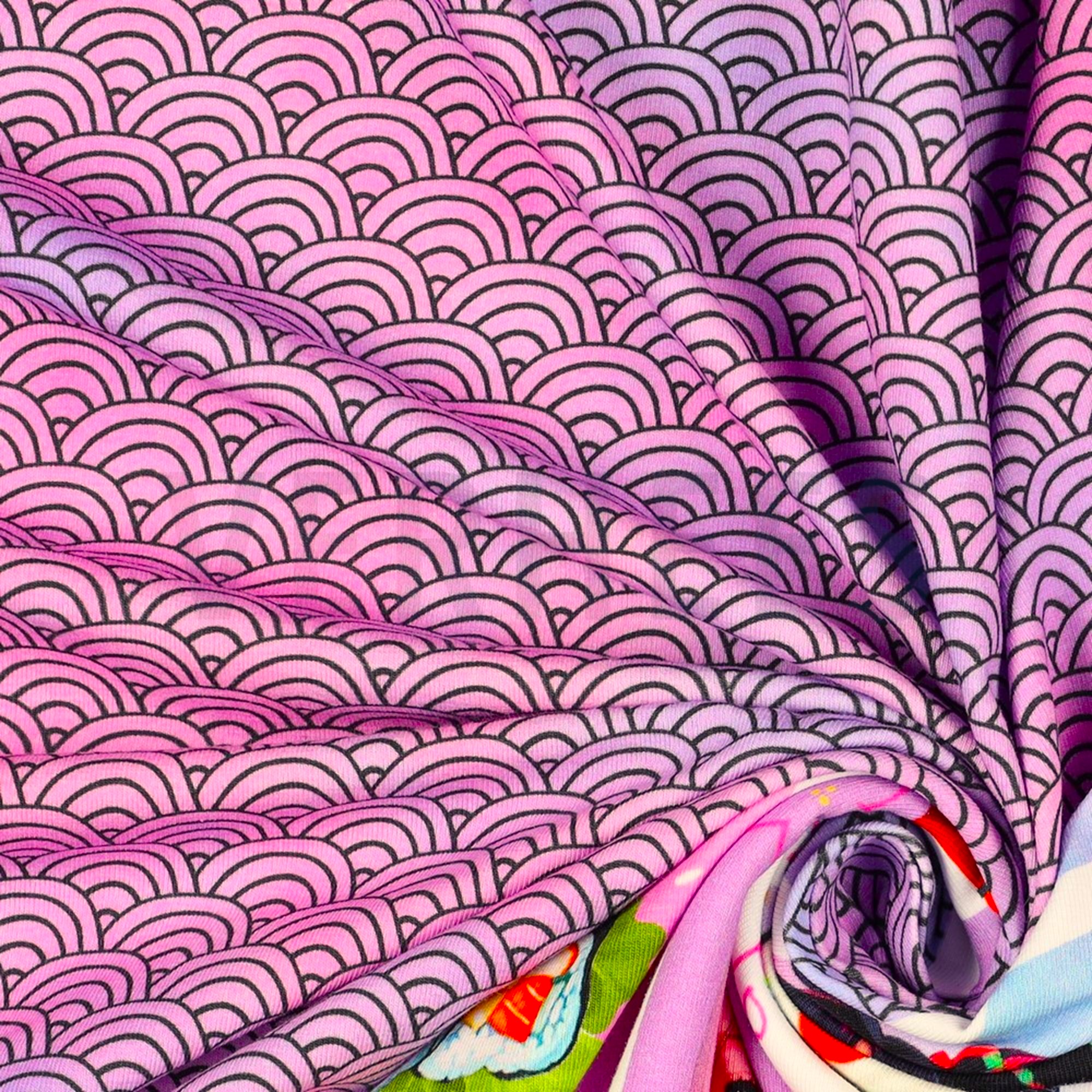 Alldeles underbart för mycket. Varje ”båge” är ca 2cm. Trikåtyg i en typisk tights/t-shirt-kvalite, med en stretch som gör att det lämpar sig både till tightare och lösare plagg. Det är mjukt, följsamt och framförallt väldigt bekvämt.