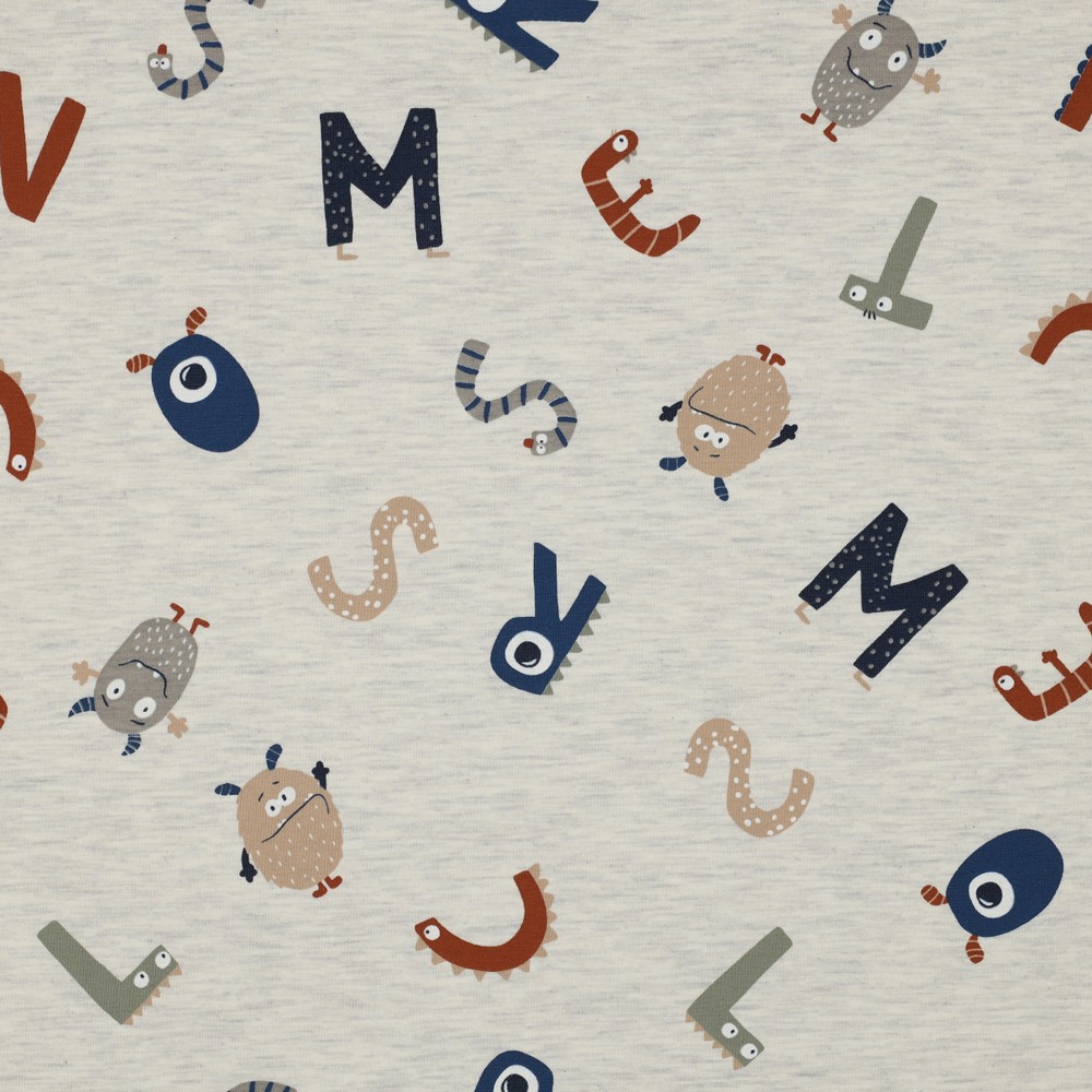 Det är nästan att en önskar att dessa små filurer fanns på riktigt. Bokstavsmonster; otroligt söta. Största bokstaven är 4cm över havet. Ett trikåtyg i en typisk tights/t-shirt-kvalite, med en stretch som gör att det lämpar sig både till tightare och lösare plagg. Det är mjukt, följsamt och framförallt väldigt bekvämt.