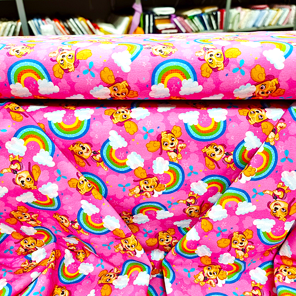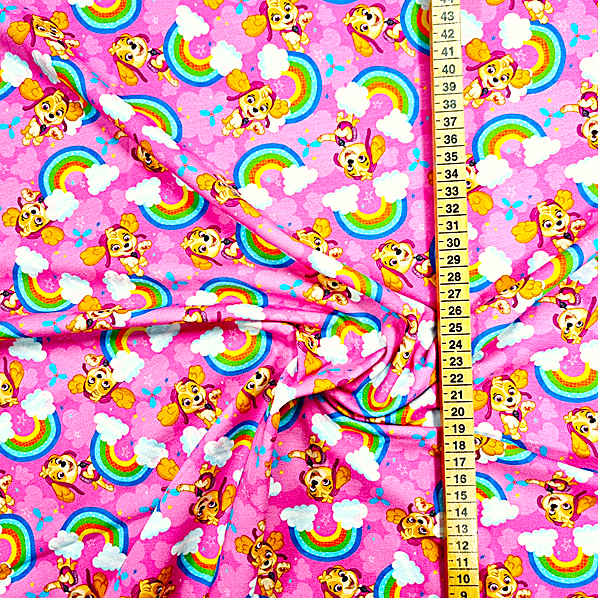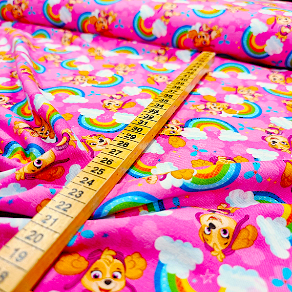 Här har du den hjälpsamma hunden Skye i härliga färger. Ett trikåtyg i en typisk tights/t-shirt-kvalité, med en stretch som gör att det lämpar sig både till tightare och lösare plagg. Det är mjukt, följsamt och framförallt väldigt bekvämt.