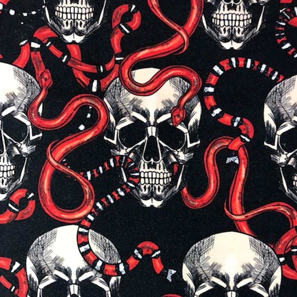 Töööffa grejer det här. Vi snackar ormar och döskallar i svart och rött. Digitaltryckt bomullstrikå av hög kvalitet. Passar bra till klädsömnad mm.