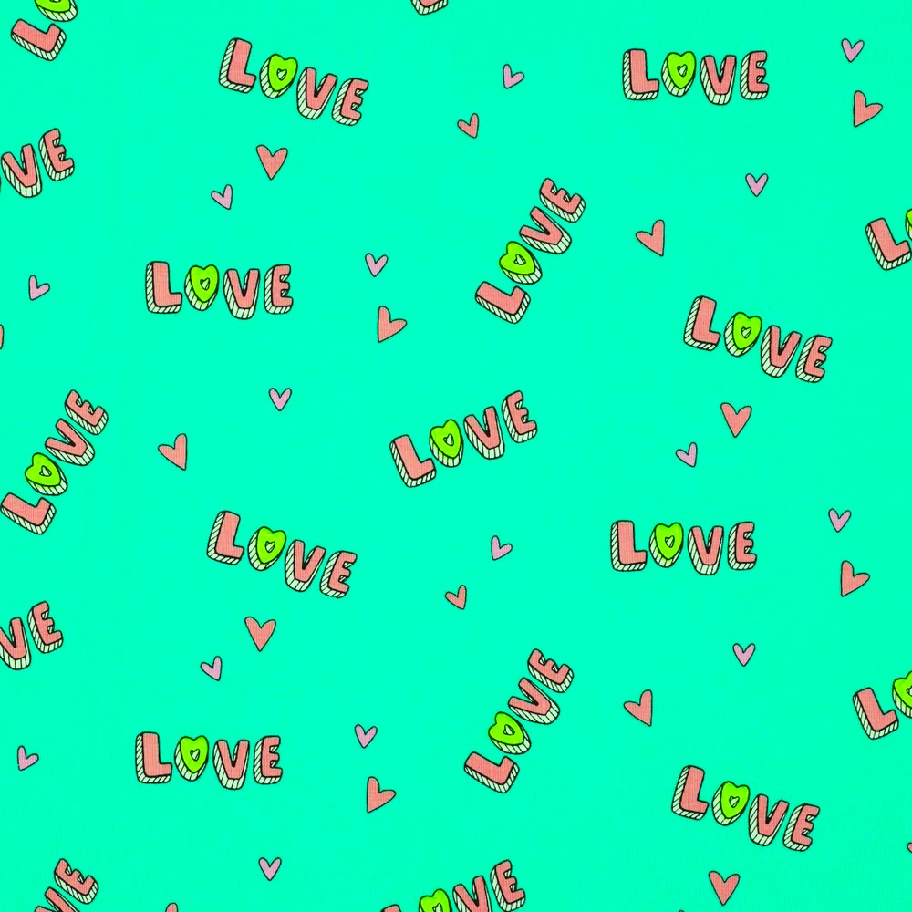 Ganska så väldigt somrigt. Glassiga färger och kärlek! Bokstäverna är ca 2cm höga. Trikåtyg i en typisk tights/t-shirt-kvalite, med en stretch som gör att det lämpar sig både till tightare och lösare plagg. Det är mjukt, följsamt och framförallt väldigt bekvämt.[/vc_column_text][/vc_column][/vc_row]
