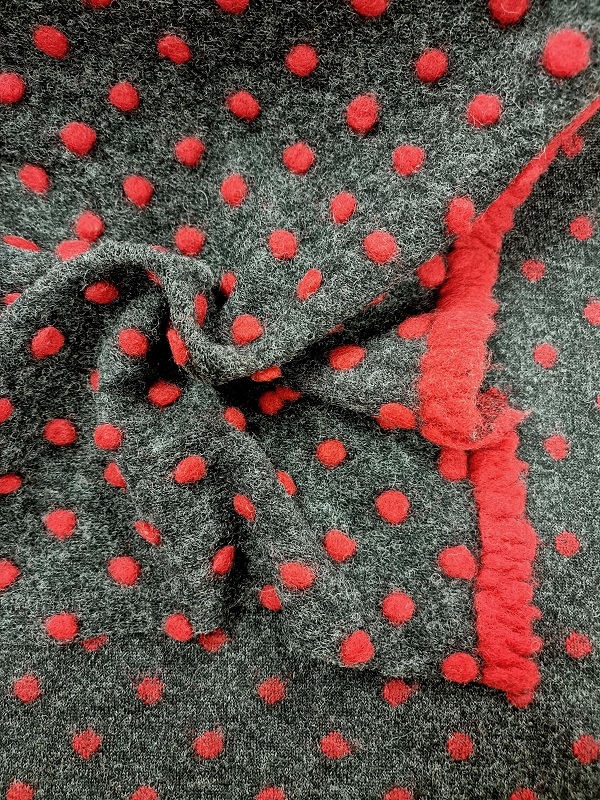En lite kraftigare stickad och valkad ullvara med ljuvliga pluppar. Valkad ull är samma som kokt ull och betyder helt enkelt att ullen efter att den stickats krympts ihop med hjälp av fukt och värme. Denna process gör att ullen både blir tätare och starkare. Eftersom den är stickad blir den automatiskt lite stretchig, men inte så pass stretchig att den funkar till tighta plagg. Detta trevliga tyg kommer absolut bäst till din rätt i form av en kappa, en kofta, en mössa, en bylsig tröja etc.