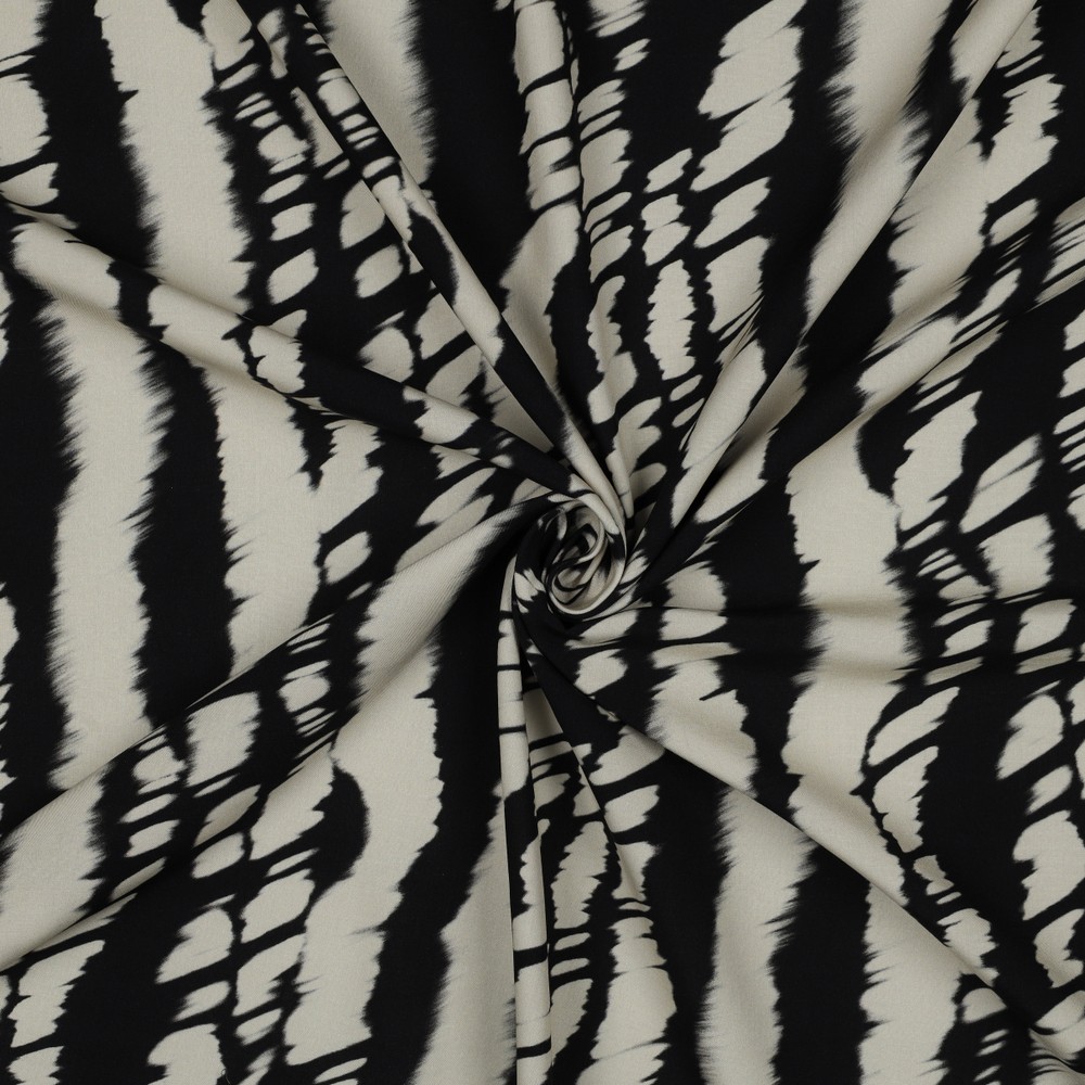Ett vackert och enkelt abstrakt mönster. Är det skuggor eller vad är det? ”Ränderna” är som bredast runt 3cm. Ett lite tunnare, riktigt mjukt, fladdrigt vävt viskostyg med bra fall. Tänk dig blusen, vida byxan, byxdressen, kaftanen, långskjortan, klänningen etc.