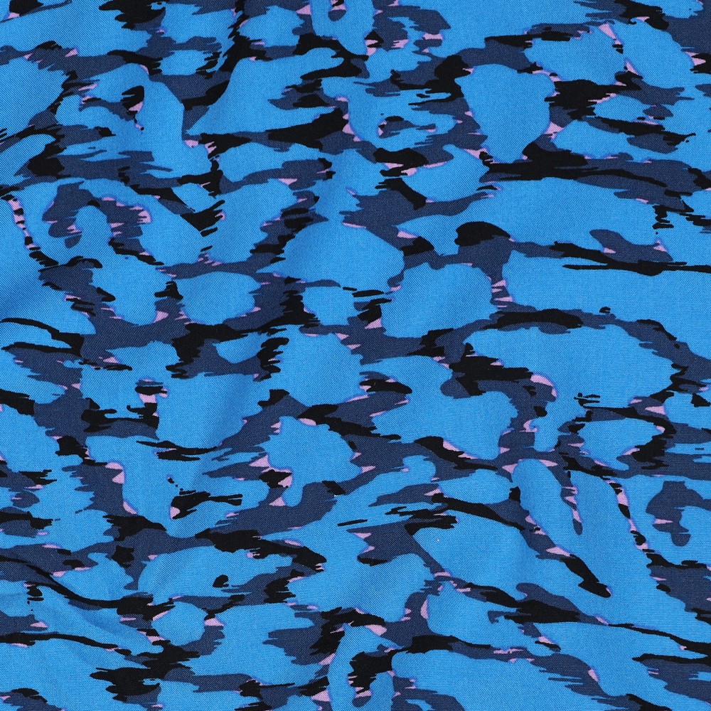 Vackra blå toner i ett lite udda abstrakt mönster som för tankarna till en insjö sent på kvällen. Ett vävt tyg med riktigt bra fall, med en mjuk och behaglig känsla. Förutom den där blusen, så kan du tänka dig vida byxan, byxdressen, kaftanen, långskjortan, klänningen etc.