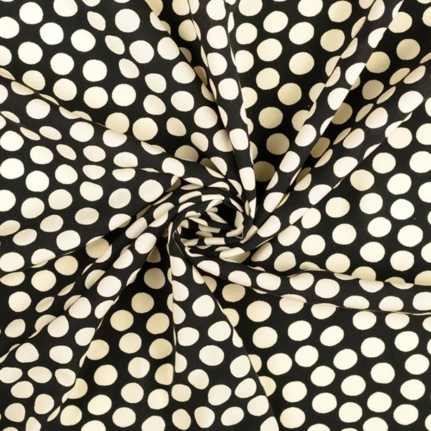 Älskade, älskade prickar. Här i en lite oregelbunden form där varje prick är strax över 1cm. Viskospoplin? Jo, det är en riktigt tätvävd ”vanlig” viskos. Den har ett lika bra fall, är mjuk och behaglig men är inte fullt lika ”fladdrig”. Förutom den där blusen, så kan du tänka dig vida byxan, byxdressen, kaftanen, långskjortan, klänningen etc.