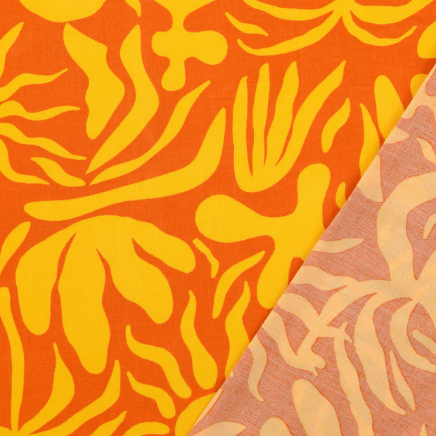 Varma toner, solar (ca 15cm stora) och kanske är det några vajande strån en anar. Visst låter det trevligt? Viskospoplin? Jo, det är en riktigt tätvävd ”vanlig” viskos. Den har ett lika bra fall, är mjuk och behaglig men är inte fullt lika ”fladdrig”. Förutom den där blusen, så kan du tänka dig vida byxan, byxdressen, kaftanen, långskjortan, klänningen etc.