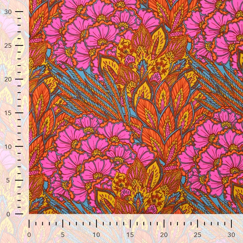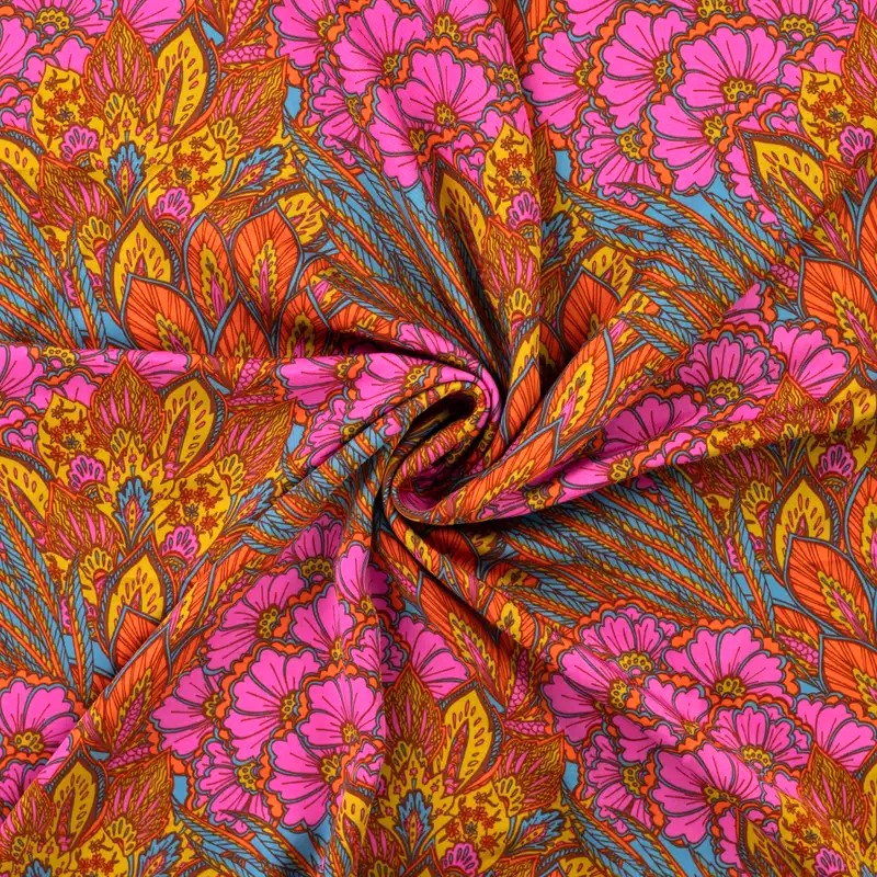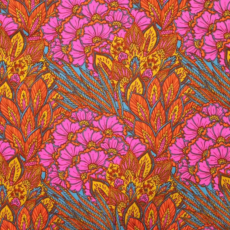 Behaglig, bombastisk och en veritabel färgbomb. Blom-mönstrat i en mjuk (nästan löjligt gött) och svagt glansig tappning. Blomklasarna är runt 20cm stora. Ett vävt tyg med tungt fall som gör sig i blusen, scarfen, kaftanen, långskjortan, klänningen etc.